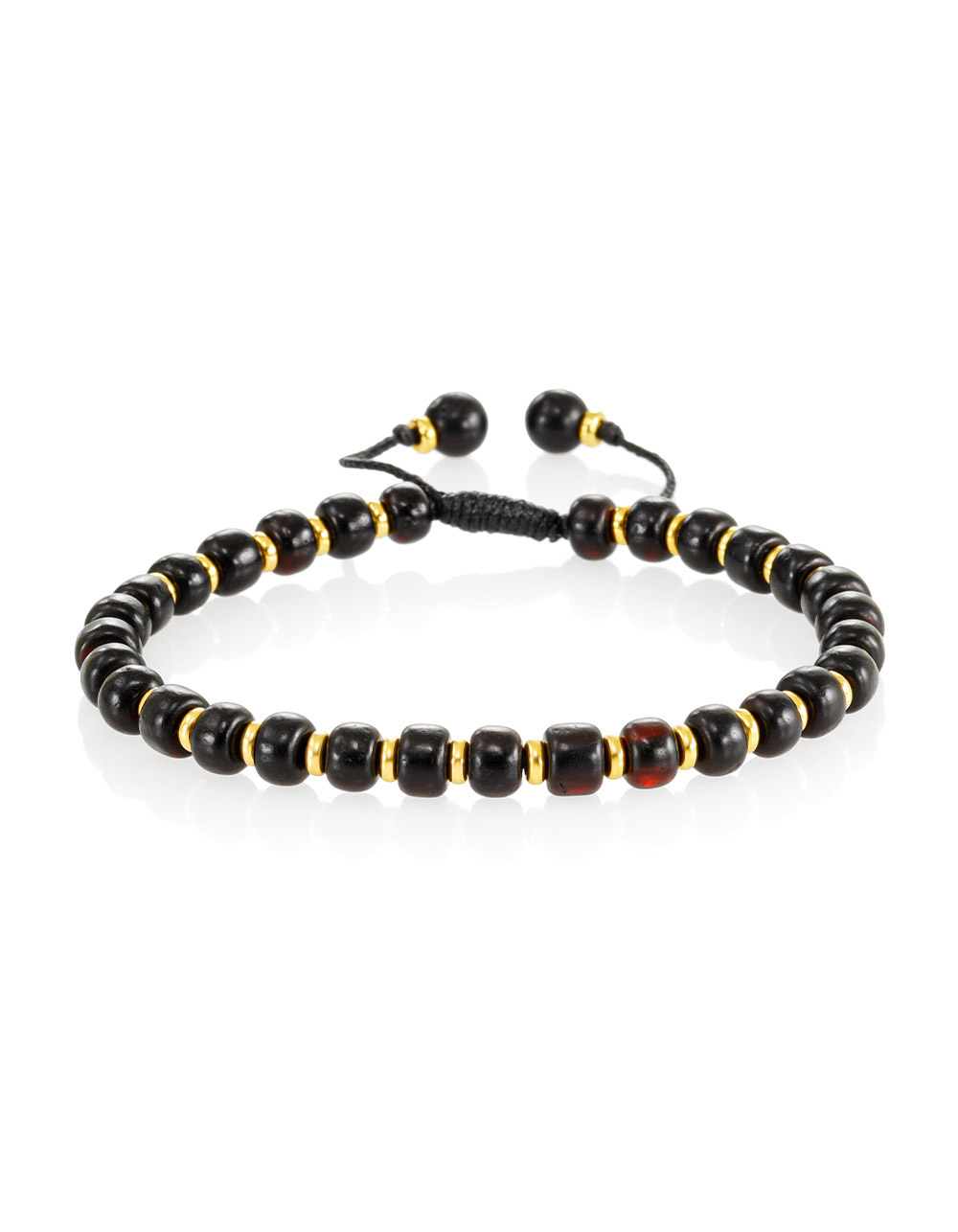 Этот браслет — голос предков, сплетённый в узор из времён, когда земля говорила на языке оберегов. Тёмно-вишнёвый янтарь, словно застывший сок древних деревьев, перекликается с золотым бисером.
