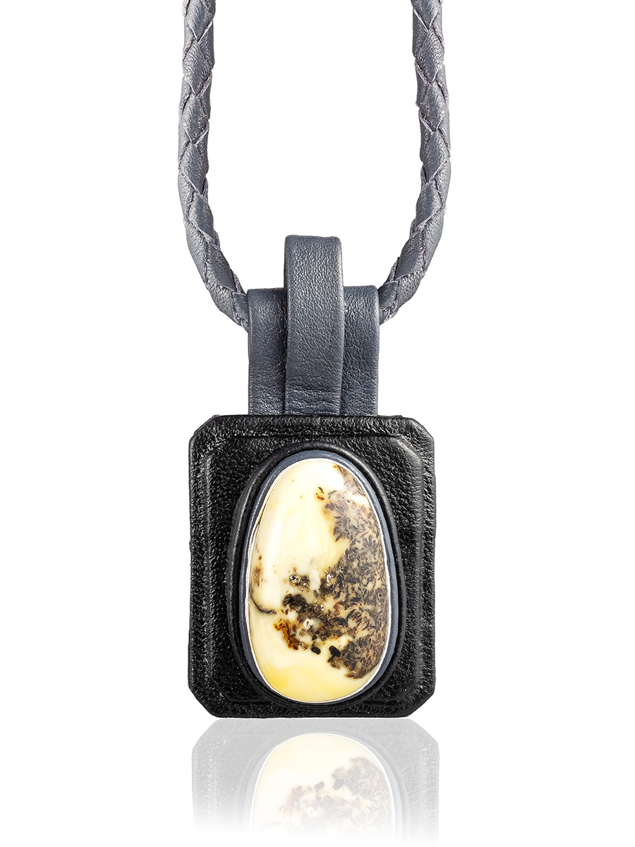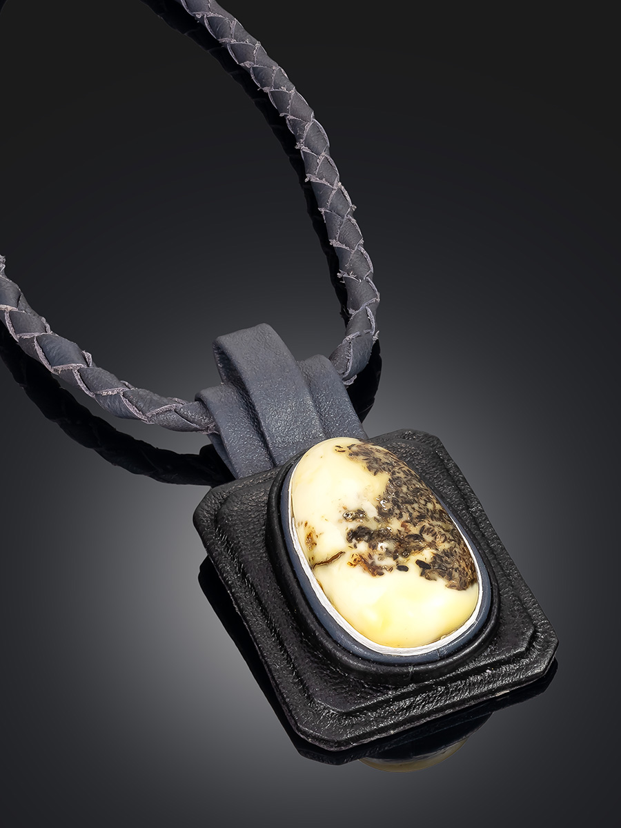 Украшение из серой кожи и белого янтаря — контраст дерзкого материала и древнего камня. Это колье-оберег хранит память о языческих богах и кострах племён, где земля и небо говорили на одном языке. Вглядитесь в янтарь и увидите, как море целует скалы, а ветер пишет стихи на песке.