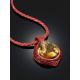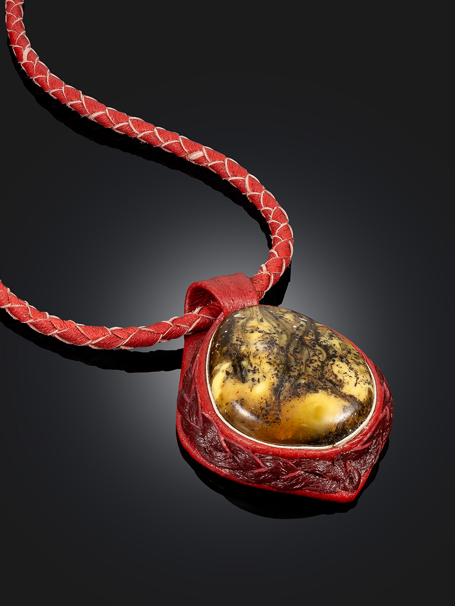 Украшение из красной кожи и белого янтаря — контраст дерзкого материала и древнего камня. Это колье-оберег хранит память о языческих богах и кострах племён, где земля и небо говорили на одном языке. Вглядитесь в янтарь и увидите, как море целует скалы, а ветер пишет стихи на песке.