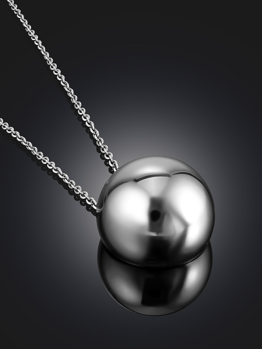 Добавьте образу футуристичного лоска с серебряным колье, украшенным эффектной подвеской в виде объемного шара. Идеальная геометрия и зеркальный блеск делают это украшение главным стильным заявлением сезона 2026.