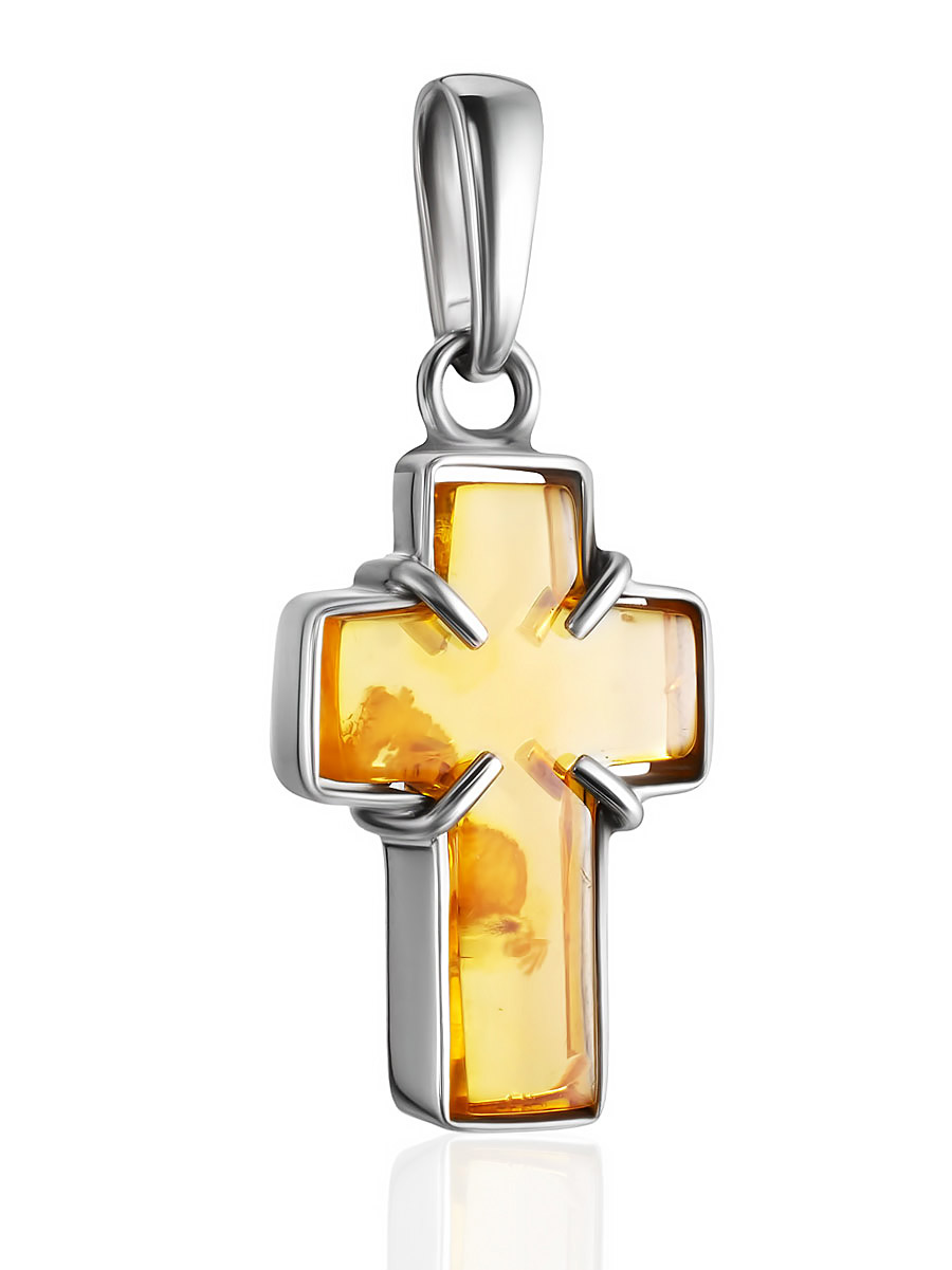 Этот крест создан вручную из цельного кусочка лимонного янтаря с текстурным облачком внутри, вставленного в литую серебряную форму. Оправа не только хорошо защищает сам янтарь, но и создаёт яркий стильный образ.